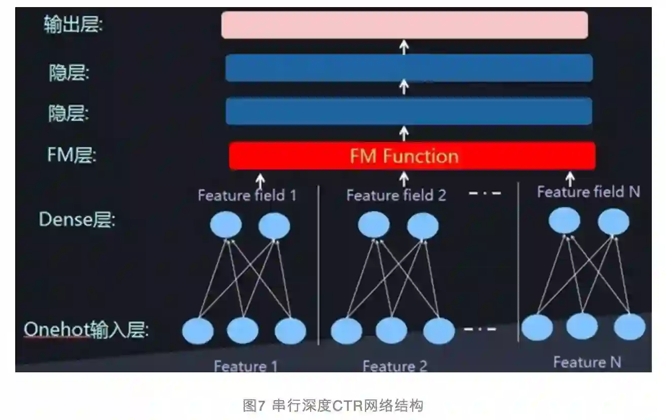 这三个网络结构特点基本囊括了目前所有深度CTR模型。图6和图7是两种常见的深度CTR网络结构,目前所有模型基本都采用了其中之一种结构。