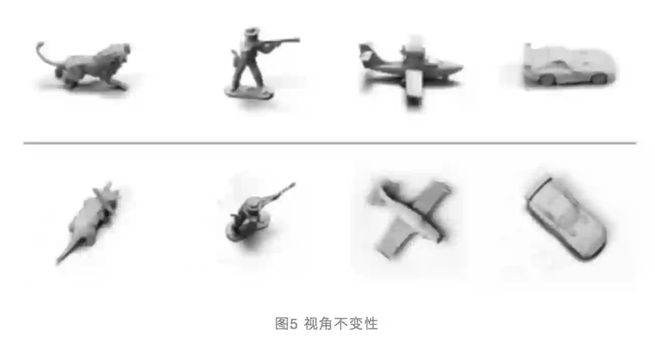 这里的一个中心,指的是Capsule的核心目的是希望将“视角不变性”能力引入图像处理系统中。所谓“视角不变性”,指的是当我们给3D物体拍照片的时候,镜头所对的一定是物体的某个角度看上去的样子,也就是2D照片反映3D物体一定是体现出了镜头和3D物体的某个视角角度,而不是360度的物体全貌。