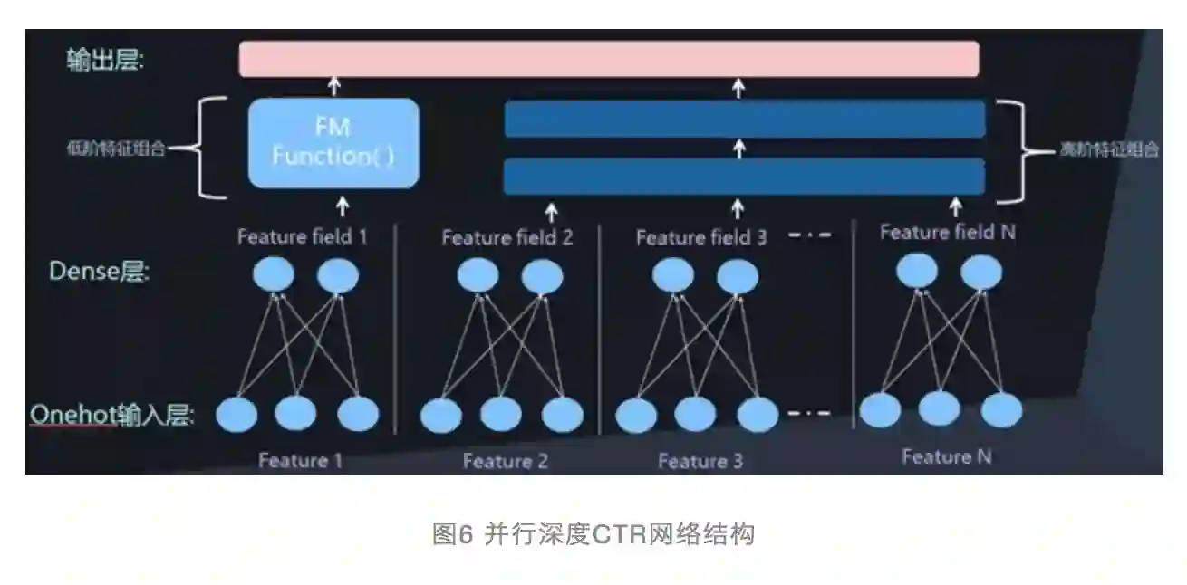 除了在网络结构上体现上述的两个特点:一个是Dense Vector表示离散特征,另外一个是利用Deep网络对特征组合进行自动建模外。另外一个主流的特点是将低维特征组合和高维特征组合在网络结构上进行分离,Deep网络体现高维度特征组合,而引入神经网络版本的FM模型来对两两特征组合进行建模。