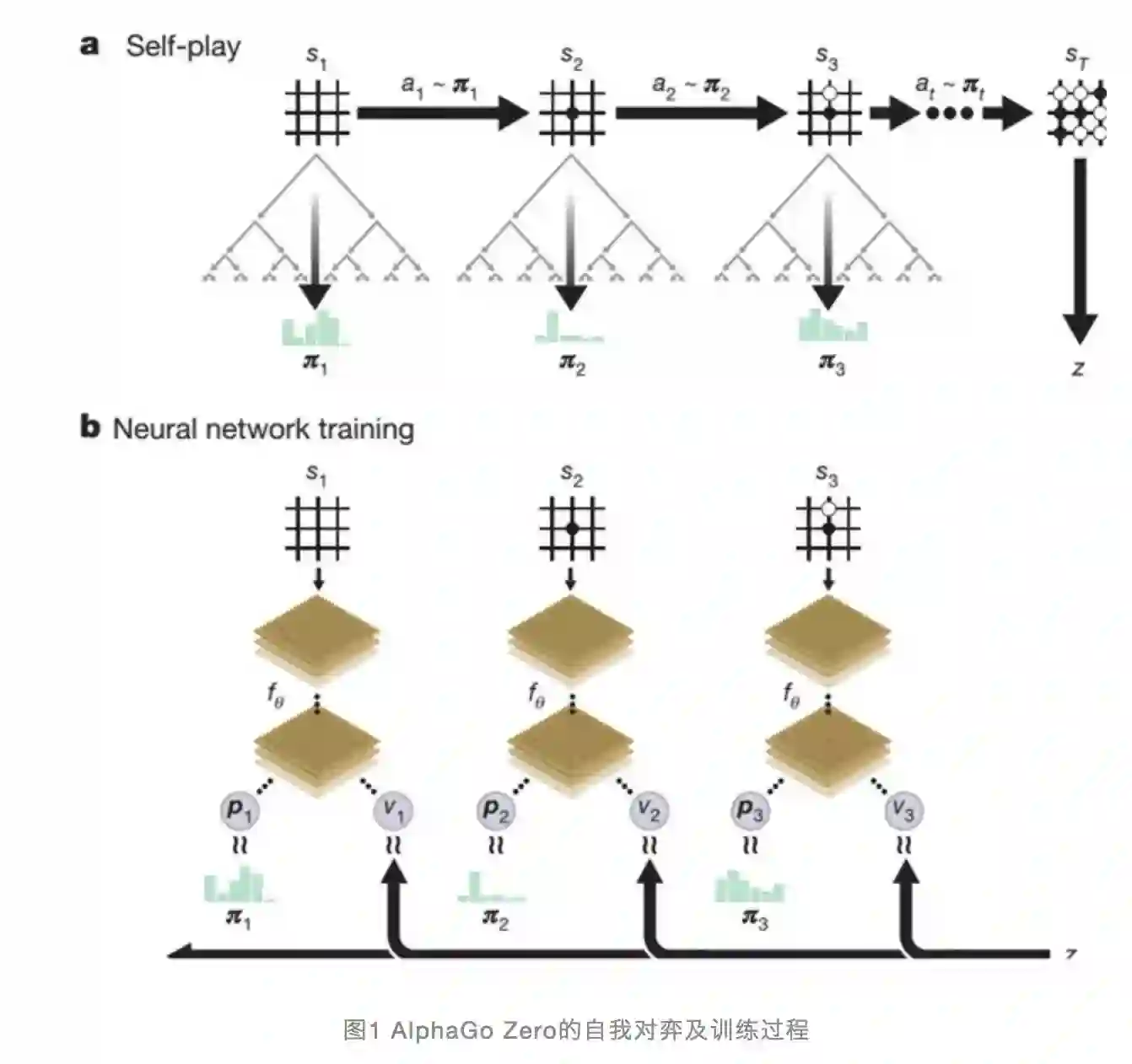 AlphaGo Zero从技术手段上和AlphaGo相比并未有本质上的改进,主体仍然是MCST蒙特卡洛搜索树加神经网络的结构以及深度增强学习训练方法,但是技术实现上简单优雅很多(参考图1)。