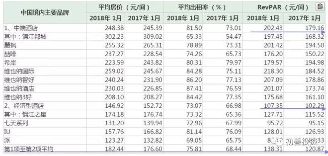 再比如我们看锦江股份2018年1月的RevPAR,较去年同期均有提高,而且是量价齐升,平均房价由176元/间增长至182元/间,入住率由68%提升至76%。