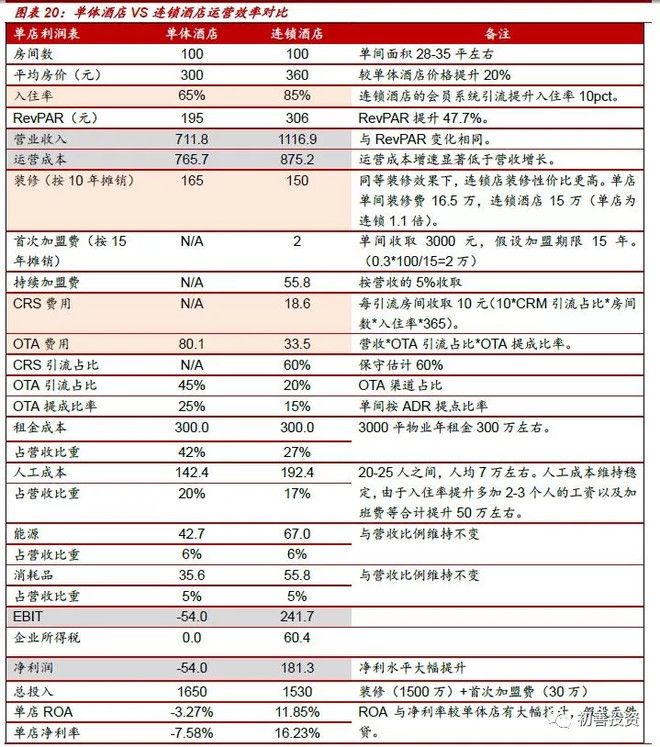 回到五一去哪儿里初善君留下的问题:为什么景区的酒店很难盈利,除了旅游本身的季节性因素及节假日导致的入住率整体偏低之外,主要问题是所有单体酒店的问题:运营效率偏低。下图是某券商的预测数据,单体酒店和连锁酒店相比,主要运营效率的变化及导致的盈利差异。