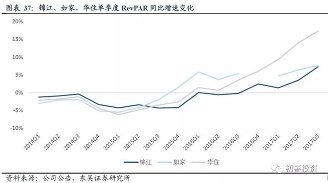 RevPAR是指什么呢?指房间单价*入住率,最能体现酒店的实际收入能力。2015年底起,锦江、如家、华住的入住率、房价和RevPAR单季度同比增速均触底反弹并持续上扬,市场复苏信号明显。
