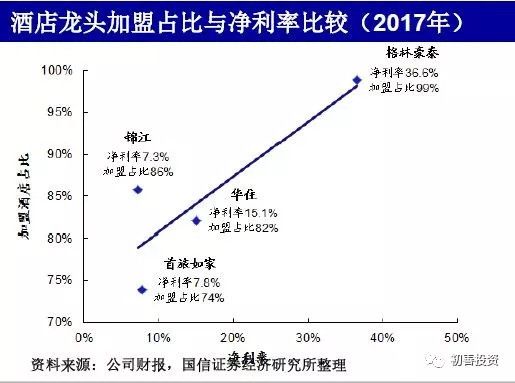 加盟比例越高,净利率越高。某券商测算:加盟收入=首次加盟费用+持续加盟费(加盟店流水的5-9%),加盟毛利率:70-75%,一般仅扣除店长工资,加盟净利率:估算40-50%;直营店盈利能力则方差极大,龙头营业利润率从持平到高峰时期20%-30%。如下图所示,格林豪泰加盟比例最高,净利率更是高达36.6%