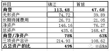 商誉、无形资产和长期待摊费用,这三个科目是我们分析酒店类公司的资产负债表必须关注的问题。截止2017年底,锦江股份和首旅酒店的商誉余额分别为113.48亿元、47.68亿元,占净资产的比例分别为78%和63%。此外,锦江股份的无形资产、长期待摊费用余额分别为74.72亿元、26.73亿元,同期首旅酒店为39.89亿元、21.05亿元。可以说这三项长期资产是酒店资产负债表的主要构成部分,占总资产的比例分别为49%和64%。