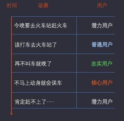 但我们可以尝试以其他维度来划分不同的用户层级,下面我们举出一些例子就能很好的理解滴滴用户的层级转变了。