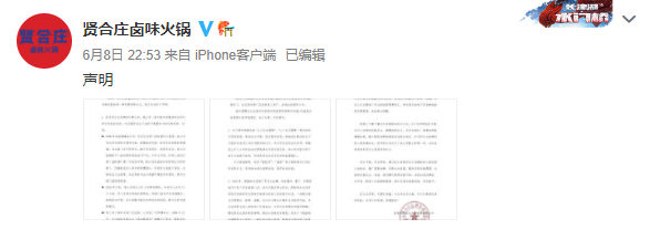 6月8日晚,贤合庄卤味火锅官方微博发布声明表示,关于网传陈赫收取“2.4亿加盟费”“3.7亿加盟费”等问题实为恶意造谣。