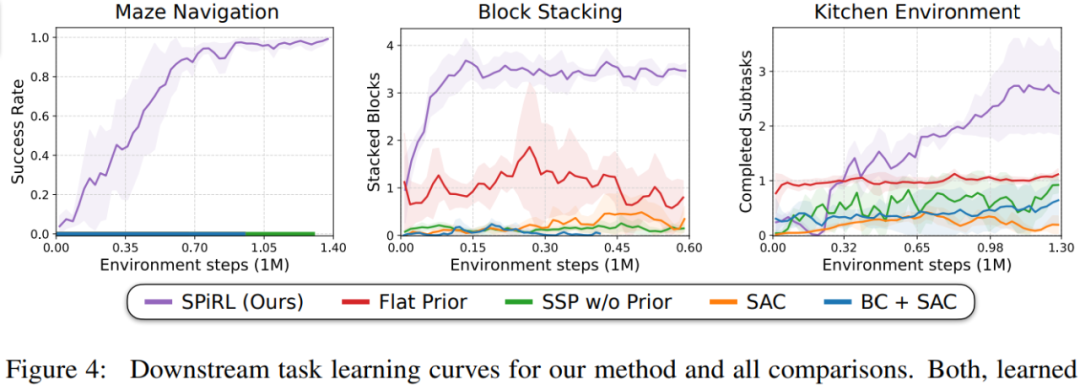 。研究者将常见的最大熵强化学习方法进行扩展,以使用技能先验引导下游学习。该研究在复杂的导航和机器人操作任务中对提出的方法 SPiRL (Skill-Prior RL) 进行验证,结果表明学得的技能先验对于从丰富数据集上进行高效技能迁移是必要的。