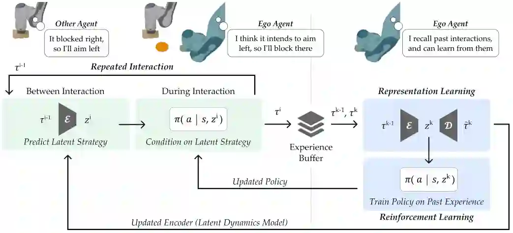 基于强化学习的框架,用来学习智能体策略的潜在表示,其中 ego 智能体确定其行为与另一智能体未来策略之间的关系