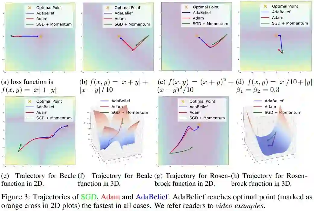 。如果观察到的梯度大大偏离了预测,那么就不信任当前的观察,采取一个较小的步长;如果观察到的梯度接近预测值,那么就相信当前的观察,并采取一个较大的步长。本文通过实验验证了 AdaBelief 同时满足 3 个优点:自适应方法的快速收敛、良好泛化性、训练稳定性。