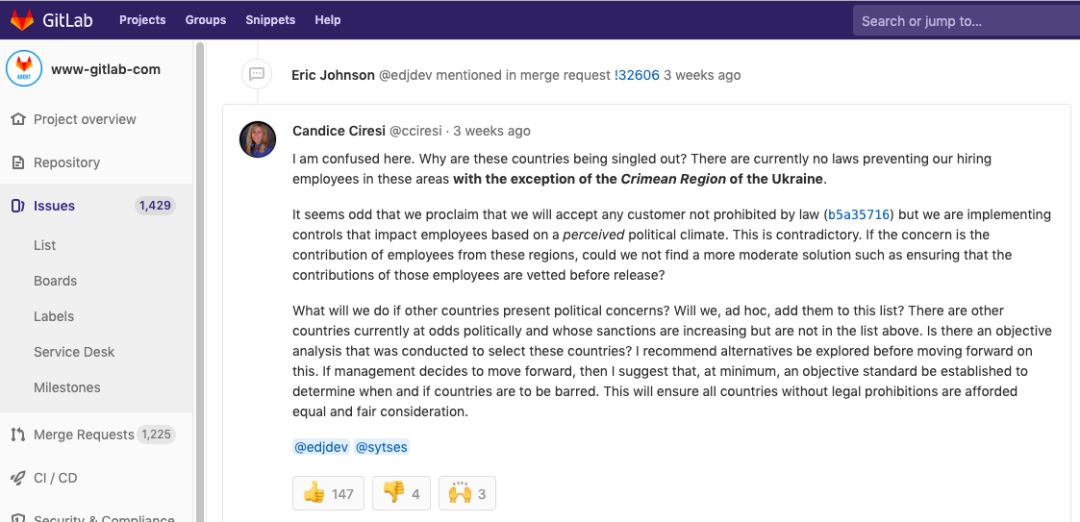 一直以来都采用完全透明化的工作方式的全球第二大开源代码托管平台 GitLab 前不久决定对有权访问客户数据的团队成员启用「工作家庭居住国家/地区封锁」,涉及国家包括中国、俄罗斯,其更新招聘流程明确 GitLab 不提供 Offer、当前有权访问客户数据的团队成员不能前往中俄,此举引发全球技术圈轩然大波。GitLab 风险与全球合规总监 Candice Ciresi 对此表示困惑提出反对意见,并最终回复因「GitLab 存在歧视和报复行为」选择离职。