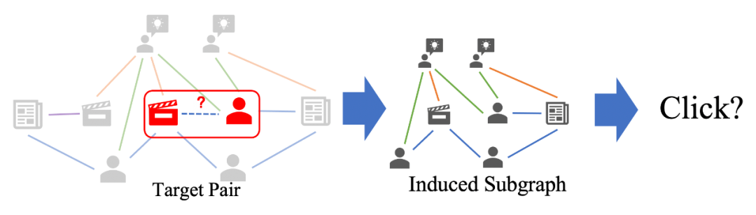 在本文中,我们提出了建模邻域信息来提高 CTR 预测的性能思路。具体的,我们将 CTR 预测建模成一个异构图上的针对目标用户 - 物品节点对的邻域子图预测问题。