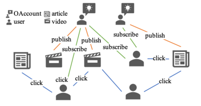 为了解决这些问题,我们提出了基于邻域交互的点击率预估 (NI-CTR) 预测模型。具体的,在微信公众号视频推荐任务中。除了视频点击关系外,还存在许多额外信息,如用户对文章或新闻的点击历史,用户和官方账号之间的订阅关系,以及官方账号和内容(视频 / 文章)之间的发布关系,都可以反映用户的点击偏好,并为推断提供重要线索。我们根据实体和关系来构建异构信息图(Heterogenous Information Network)。