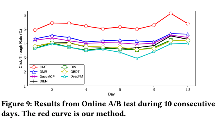 更进一步的,我们将模型实际部署到了微信公众号视频的线上推荐场景。在连续 10 天测试中,我们的方法都取得了最高的 CTR 成绩。实际部署中,节点关系和特征是按照天为单位更新。训练用的点击数据则是以小时为单位更新。整个训练是在 16 张 V100 GPU 进行。