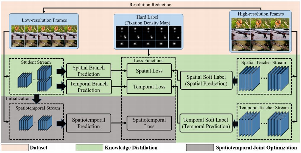 本文提出的耦合知识蒸馏方法的总体架构图,包含空间教师流、时序教师、学生流和时空流。训练分为两步:知识蒸馏和时空联合优化。