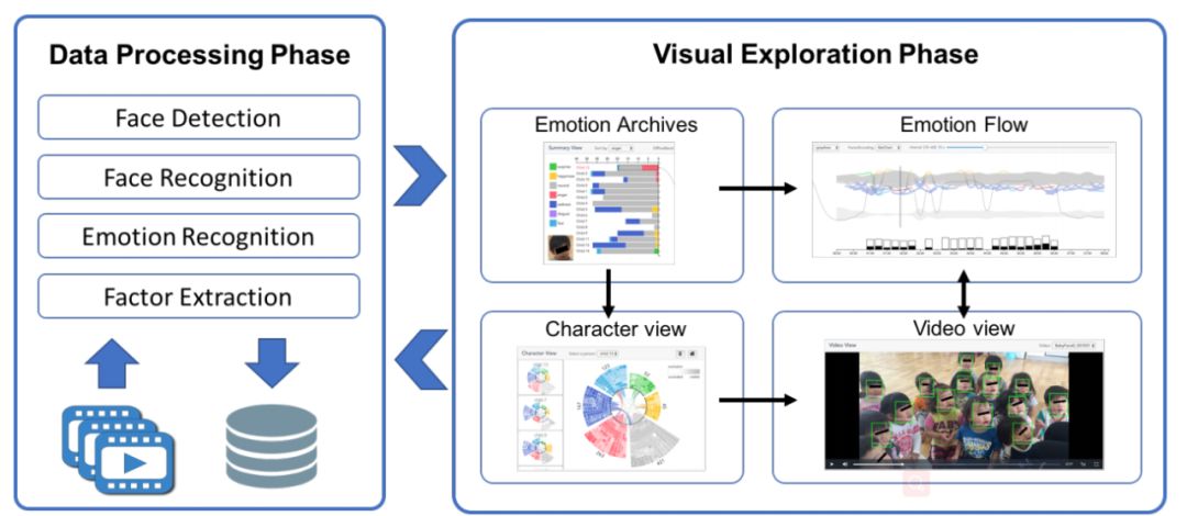 整个系统的工作流程,包括数据处理和视觉探索两大阶段