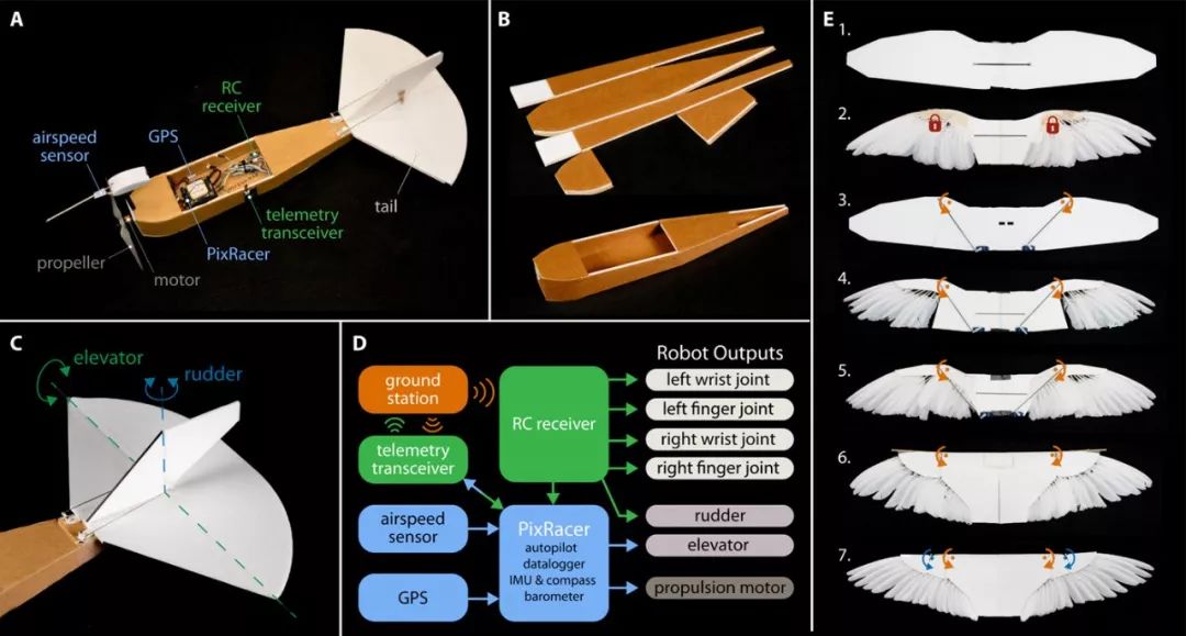 鸽子机器人整体羽翼架构包含一个螺旋桨驱动的仪表板和一个欠驱动的真实羽毛变形翼。
