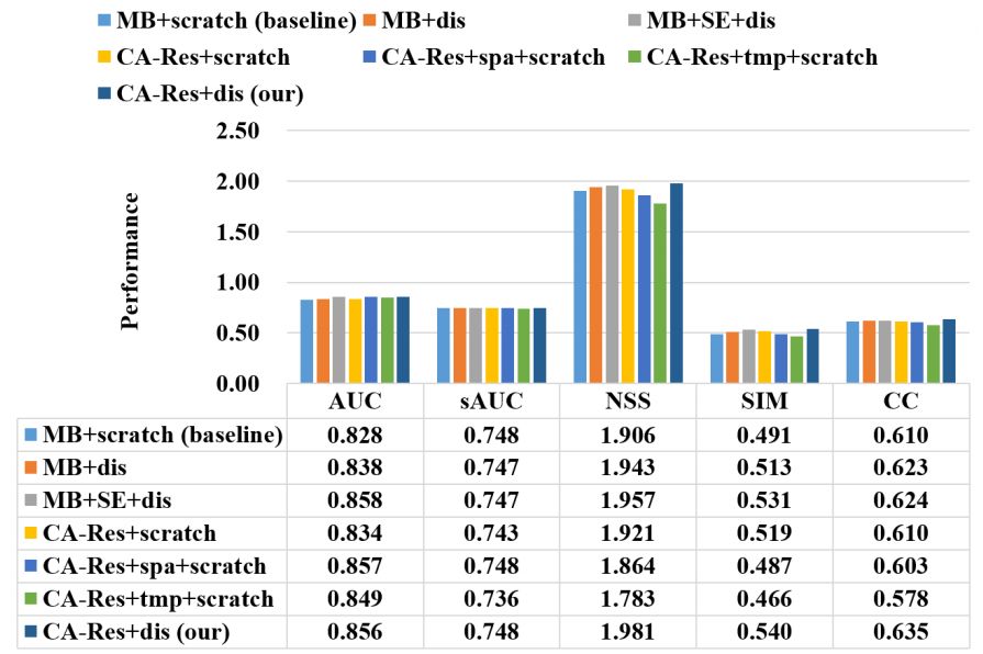 本文提出的网络架构与其他 6 种控制变量模型在 AVS1K 数据集上的各指标结果对比。