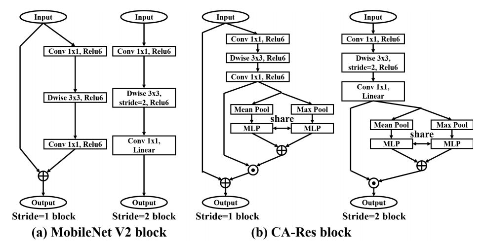 MobileNet V2 卷积块和 CA-Res 卷积块详细流程图。