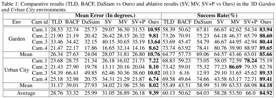对于监控场景下的多相机主动追踪任务,本文提出的这种多相机协同追踪系统可以在视觉信息不完善的情况下保证追踪性能,得出了优于以往方法的结果。在全新测试环境(Garden/UrbanCity)上的结果展示了