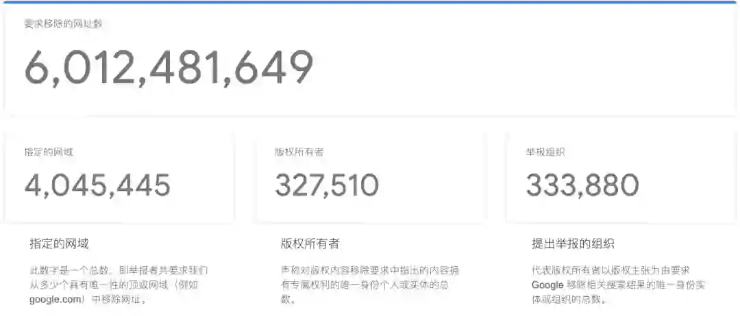 经常会有举报者要求谷歌从搜索结果中移除可能侵犯版权的内容。最新数据显示,从谷歌搜索结果中移除链接的数据最近达到了一个前所未有的里程碑——超过了 60 亿大关。
