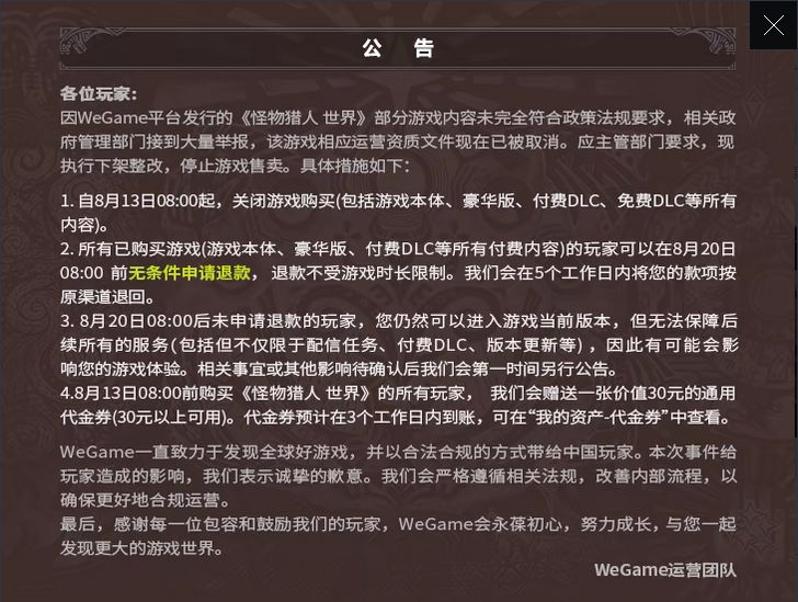 8 月 13 日上午,当我再次打开 WeGame 平台,像平常一样要进入怪物猎人世界时,一份简单的公告却宣告了游戏的末日。WeGame 运营团队表示,因游戏部分内容未完全符合政策法规要求,相关政府管理部门接到大量举报,游戏相应运营资质文件已被取消,将对游戏下架。