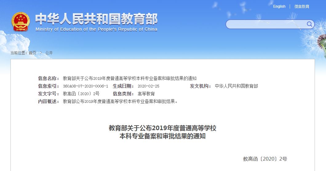 3 月 3 日,教育部官方网站更新了「关于公布 2019 年度普通高等学校本科专业备案和审批结果的通知」。各高校新增备案专业 1672 个、审批专业 181 个(含 130 个国家控制布点专业和 51 个目录外新专业),调整学位授予门类或修业年限专业 47 个,撤销专业 367 个。