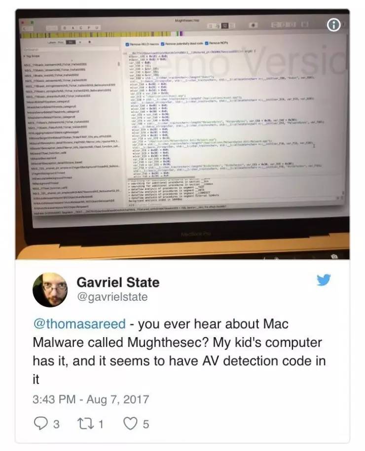 也有安全研究人员追踪了 Mughthesec 运行轨迹,并指出 Mughthesec 可以将其伪装成一个 Adobe Flash 播放器安装程序,如果其检测到一个虚拟机器,将会安装合法的拷贝。但如果是真实机器,它会安装上Advanced Mac Cleaner, Safe Finder 和 Booking.com 三个恶意广告程序。