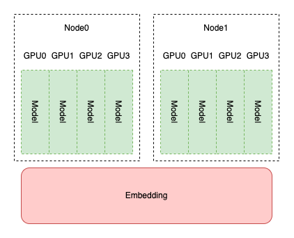 在推荐系统中,模型主体参数相较 Embedding 则小的多。因此我们一般将 Embedding 部分设置为模型并行,模型主体设置为数据并行。通过使用多机多卡,可进一步提升 Embedding 大小。