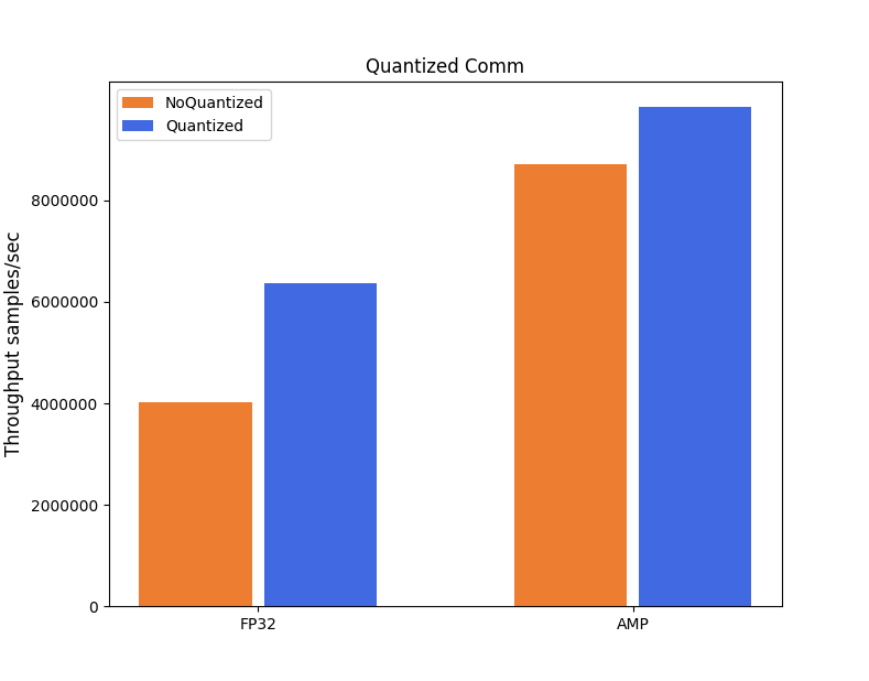 测试结果表明,在不影响模型精度的前提下, 量化通信在 FP32 的情况下相比默认通信模式有 64% 的提升, 在混合精度的情况下有 13% 的提升。