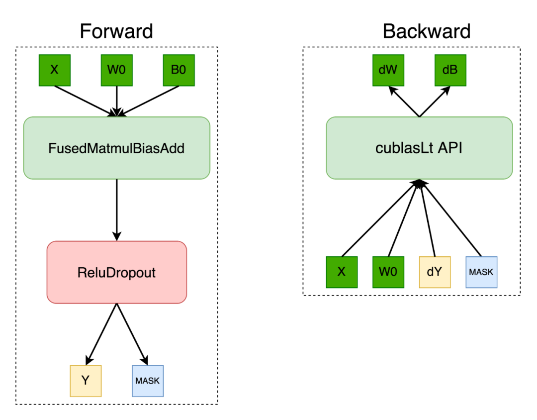 而对于带 Dropout 操作的全连接层,OneFlow 深度定制了其中的 ReluDropout 操作,使用 bitmask 形式存储前向产生的 mask,在反向传播中,通过设置 cublasLt 矩阵乘的参数 alpha=dropout_scale 以实现反向算子融合。