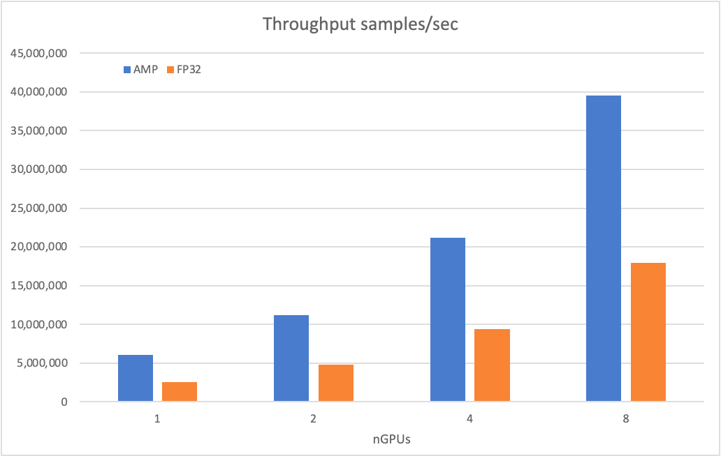 可以看到,随着 GPU 设备数的增加,模型吞吐量均能显著增加,在混合精度情况下,单张 GPU 能有 600 万的吞吐量,当扩展到 8 张 GPU 时能有近 4000 万的吞吐量。
