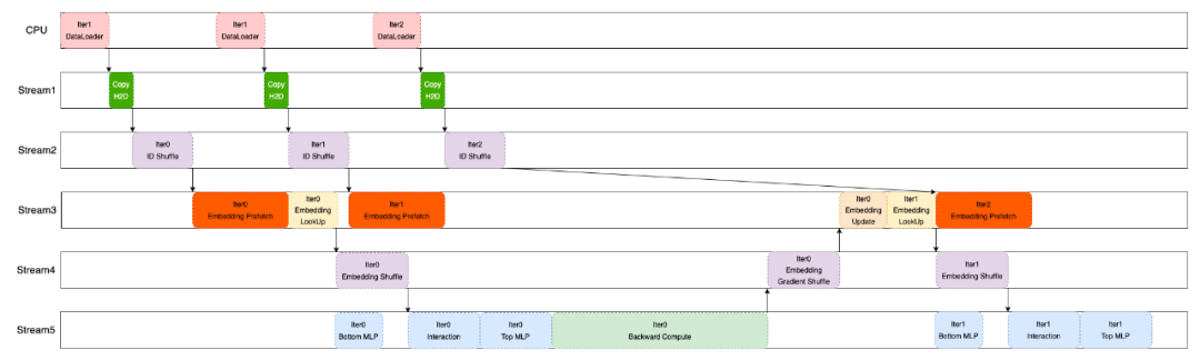 在 Embedding 数据查询交换的过程中,与 Embedding 操作无关的 Dense Feature 可以进入到 Bottom MLP 进行计算,在时间上进行重叠。完整的重叠执行时序如下图所示。