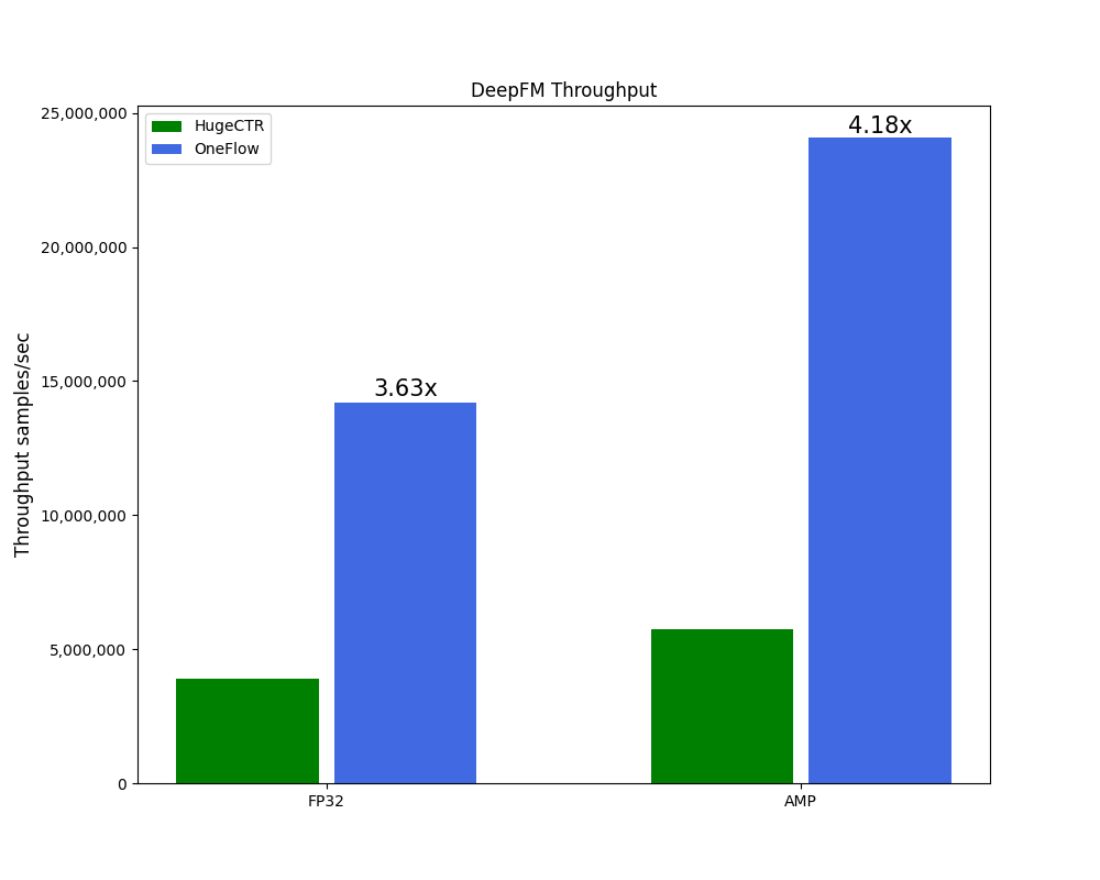 通过分层存储让单卡也能支持 TB 级模型的训练,通过横向扩展让模型容量没有天花板,通过 OneFlow 的自动流水线机制、算子优化和通信量化压缩等技术实现极致性能,在用法像 PyTorch 一样简单的前提下, OneEmbedding 在 DLRM 模型上性能是 TorchRec 的 3 倍以上,开启 TorchRec 没有支持的混合精度后,OneEmbedding 的性能更是 TorchRec 的 7 倍以上。
