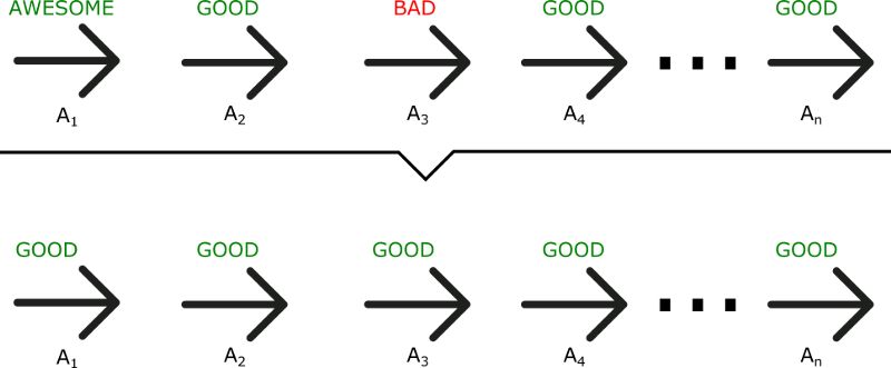 正如我们在这个例子中所看到的,尽管A3 是一个不好的行动(会造成负奖励),总回报(total reward)的重要评分使得所有被执行过的行动的策略参数被平均。