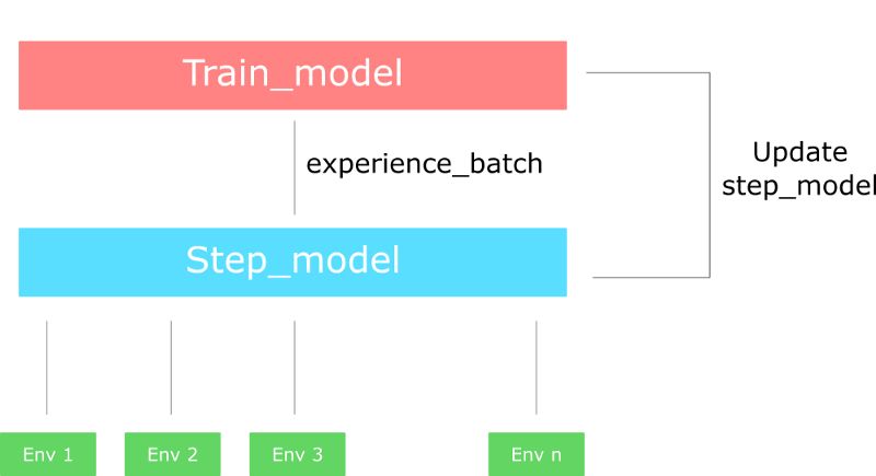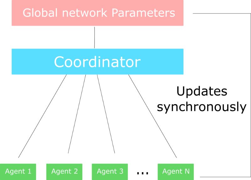 这就是为什么A2C在更新全局参数之前等待每个actor模型完成他们网络的各自部分的经验训练的原因。然后,我们重新开始一个使用各自部分经验的新训练,并且所有并行模型具有相同的新参数。