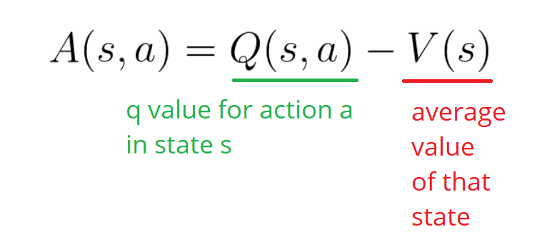 该函数给出相比在当前状态下采用平均行动(动作值函数)的优势值。换句话说,如果我采取这个行动,该函数计算我这个行动得到的奖励。