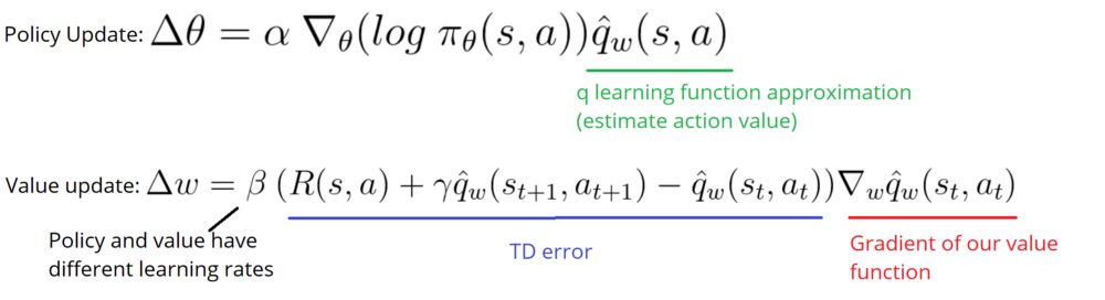 表演者-评论家模型是一个更好的得分函数。我们不会像在蒙特卡洛这种传统强化学习方法那样,等到情景episode结束才更新参数,而是在每个步骤进行更新(即时序差分学习,TD学习)。