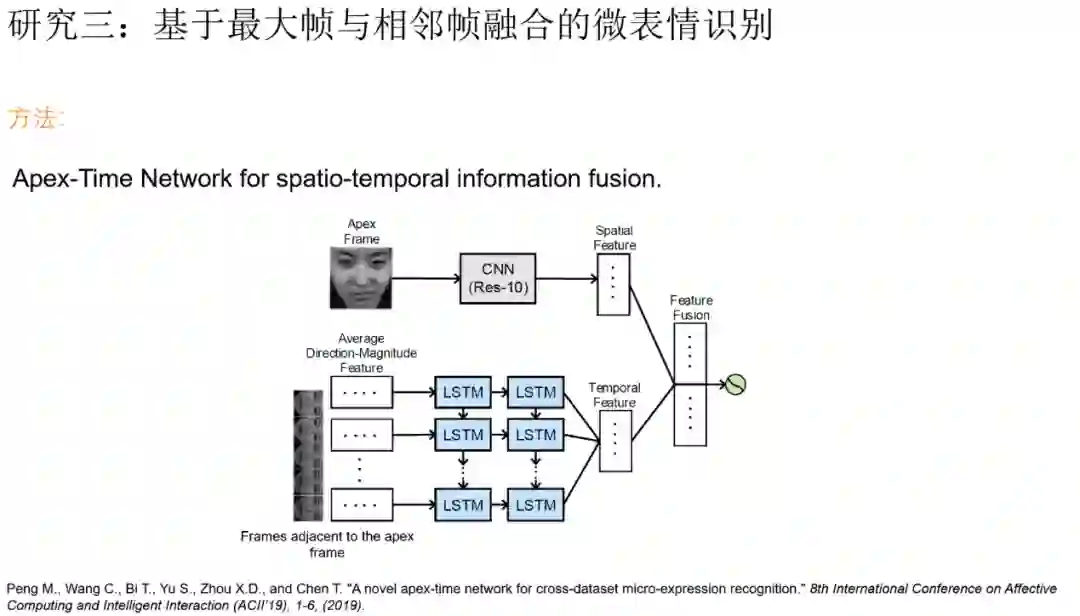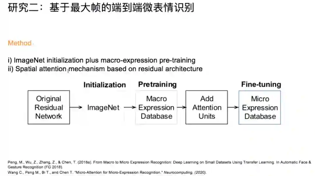 其次,彭敏介绍了基于最大帧的微表情识别(apex-frame-based recognition)方法,即利用人工标定的微表情序列最大帧,将基于视频的识别转移到基于单张图片的识别,以此利用大量宏表情图片进行迁移学习来解决微表情视频样本少而网络容易过拟合现象,以及利用图像研究领域的注意力机制进行针对性学习,进而取得更好的识别效果。