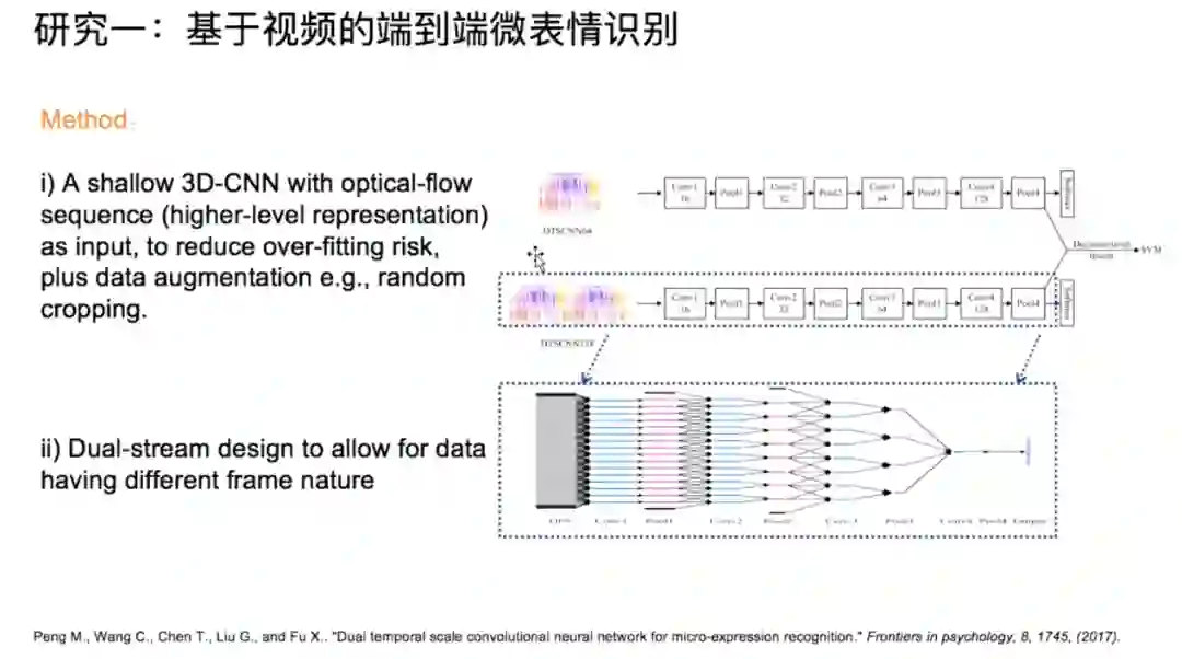 讲座的第一部分由来自中国科学院大学的彭敏博士研究生进行介绍,主题为视频与最大帧的识别。首先,彭敏介绍了基于微表情视频的识别 (video-based recognition),即把微表情视频整段输入到网络进行端到端的分类学习。具体地,他们提出了一个基于三维卷积网络的双通道模型,能够在不同时间尺度下进行时空特征提取。方法结果验证了高阶特征例如光流特征等作为网络输入有助于提升微表情的识别性能,同时视频中帧之间的时序关系也有助于微表情的识别。