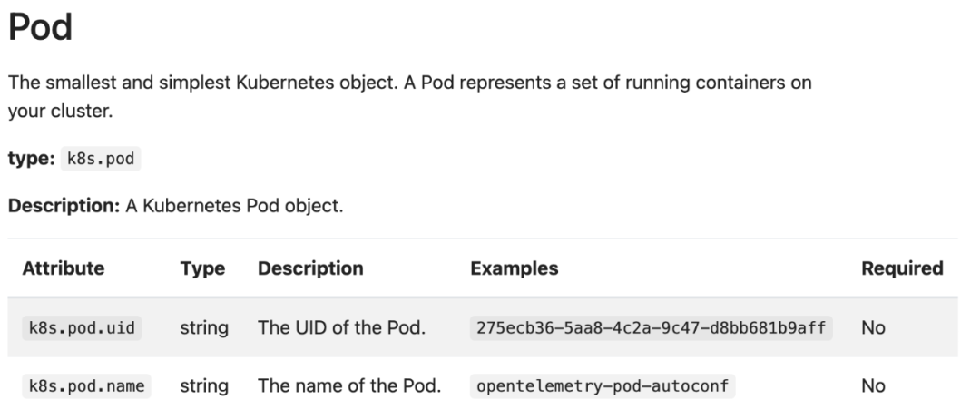 从数据的角度看属性是一个键值对,本质上属性描述了空间信息,方便从空间上做数据关联。OTel 定义了很多通用的属性,如果定义不明确或数据不一致时,是没法自动关联分析的。下面是 Otel 定义的 K8S 的 Pod 属性: