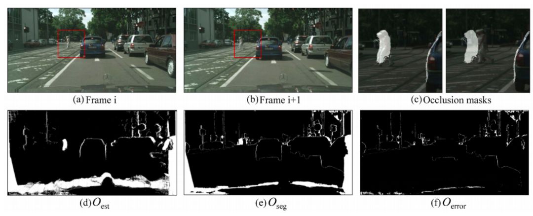 在计算光流估计的损失函数时,作者不考虑遮挡区域(O_{est})的损失,而加大重点区域(O_{error})的权重,遮挡估计的示意图如图3所示。