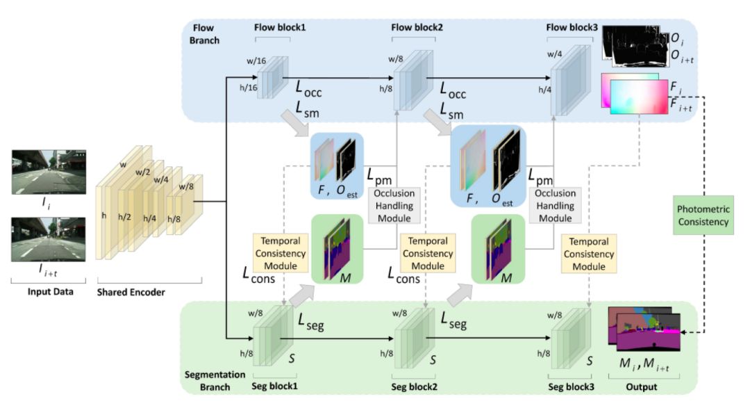 为了解决上述两个问题,作者提出了一个光流和语义分割联合学习的框架,语义分割为光流和遮挡估计提供了更丰富的语义信息,而非遮挡得光流保证了语义分割的像素级别的时序一致性。
