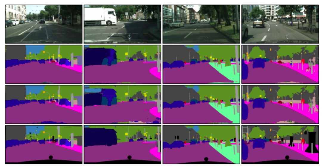 Cityscapes验证集分割结果,从上至下分别为原图,本文算法分割结果,PSPNet分割结果和GT。
