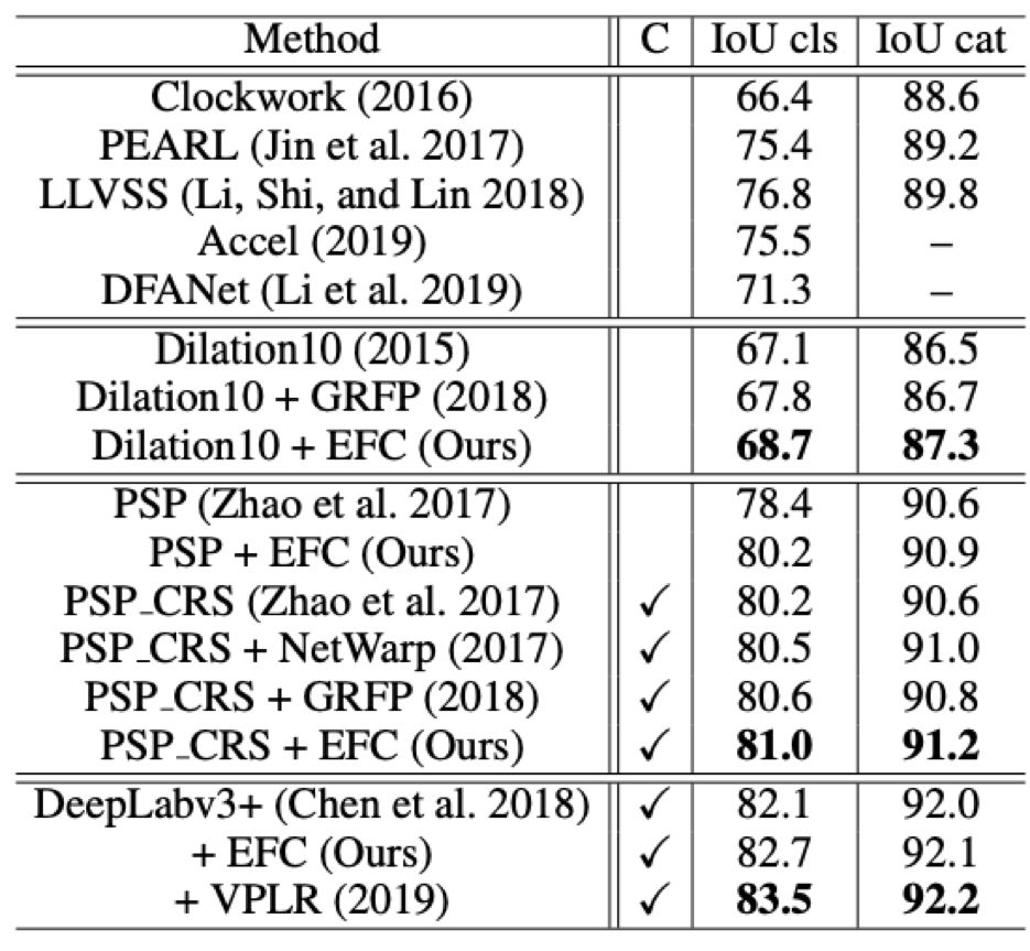 (Fayyaz et al. 2016; Jin et al. 2017; Gadde,Jampani, and Gehler 2017; Nilsson and Sminchisescu 2018; Hur and Roth 2016) 通过光流指导的特征融合来获得更好的分割准确率。