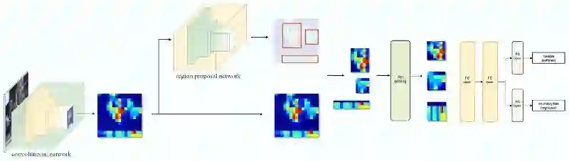 Mask R-CNN--Faster R-CNN采用一个CNN特征提取其来提取图像特征。然后使用CNN区域建议网络来生成感兴趣区域(Roi)。我们应用RoI池化层将它们打包以形成固定维度。然后将其作为全连接层的输入来进行分类和边界框预测。