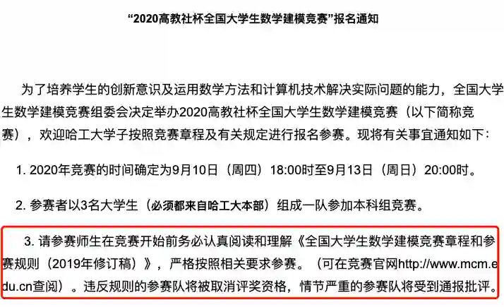 哈工大6月17号,发布了此次2020年全国大学生数学建模竞赛的报名通知,通知要求参赛队伍,务必认真阅读和理解《全国大学生数学建模竞赛章程和参赛规则(2019年修订稿)》,严格按照相关要求参赛。