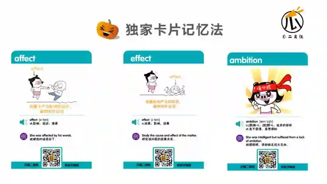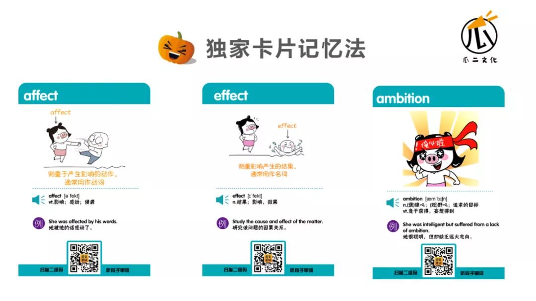 南瓜姐姐最大的特点,是想把学习(背单词)这件正经事,变得不那么严肃。根据不同学段的人群特征,南瓜姐姐总结了 12 种记忆方法,如常见的分拆联想、错拼联想、追根溯源、词根分析等。其中,谐音和段子是南瓜姐姐最常用的手法。以“finance”为例:“中国有句老话叫做有钱能使鬼推磨,真正让人犯难之死的不就是钱那点事儿吗?所以finance表示资金和财务了。”