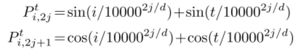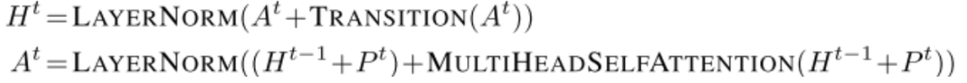 之前Transformer的位置编码因为因为层数是固定的,所以不需要将层数编码进去。大师Universal Transforer模型多了一个时间维度,因此每一次循环都需要进行一轮坐标编码,公式为: