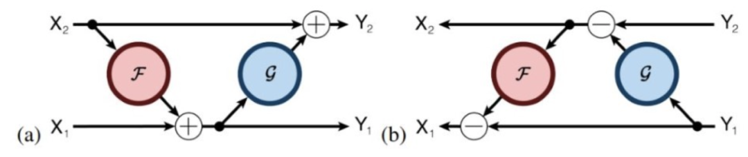 这里作者借鉴了RevNet的思想,不保留中间残差连接部分的输入了,取而代之的,是应用一种“可逆层”的思路,就如同下图中所示的那样,(a)为前向传播,(b)为反向传播。